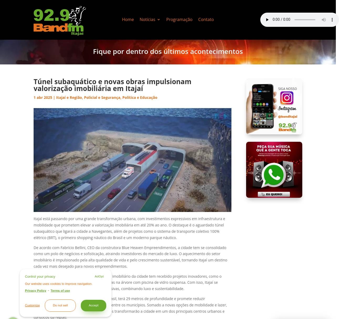 Túnel subaquático e novas obras impulsionam valorização imobiliária em Itajaí Band FM Itajaí